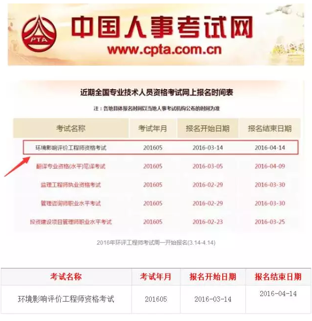 中國人事考試網3月12日公布“近期全國專業技術人員資格考試網上報名時間表”,其中“環境影響評價工程師資格考試”報名開始日期2016-03-14,報名結束日期2016-04-14。