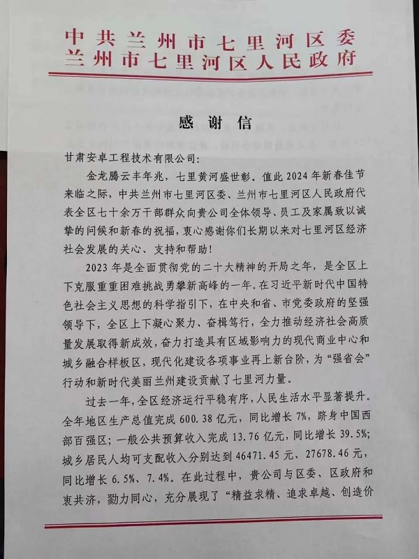 在這封充滿溫馨問候和新春祝福的感謝信中,中共蘭州市七里河區委與蘭州市七里河區人民政府對甘肅安卓過去一年的工作表示了認可與感謝。他們提到,甘肅安卓以“精益求精、追求卓越、創造價值”為準則,在推動全區改革發展方面默默付出,為區域經濟社會的高質量發展做出了自己的貢獻。同時,甘肅安卓的努力也為七里河區現代化建設各項事業的穩步提升提供了助力。區委、區政府在信末送上了新年的美好祝愿,期望甘肅安卓未來繼續發揮引領作用,為七里河區乃至全市的繁榮與進步貢獻更多力量。