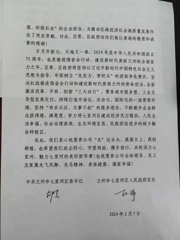 歲末年關,新春將至。近日,中共蘭州市七里河區委、蘭州市七里河區人民政府發來感謝信。